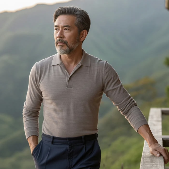 上品な快適さを身にまとう、洗練された一着。繊細なリブ編みの質感とモダンなシルエットが、落ち着いた自信と品格を感じさせます。静かな存在感を求める大人の男性にぴったりです。